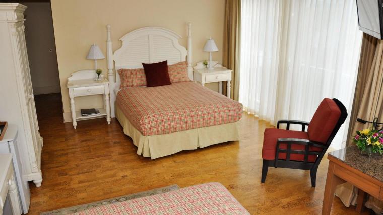 The Arms Lake View guestrooms offer one king or two queen beds and are located in the Eldorado Arms wing. The view of Okanagan Lake, looking in a southerly direction, is spectacular. These spacious guestrooms feature private bathrooms, cork flooring, custom white washed furnishings, eight ft. floor to ceiling windows, Telus Optik TV, in-room movies, and high speed or wireless internet. The bathroom has a shower/tub combination. The approximate square footage is 345-389 sq. ft.