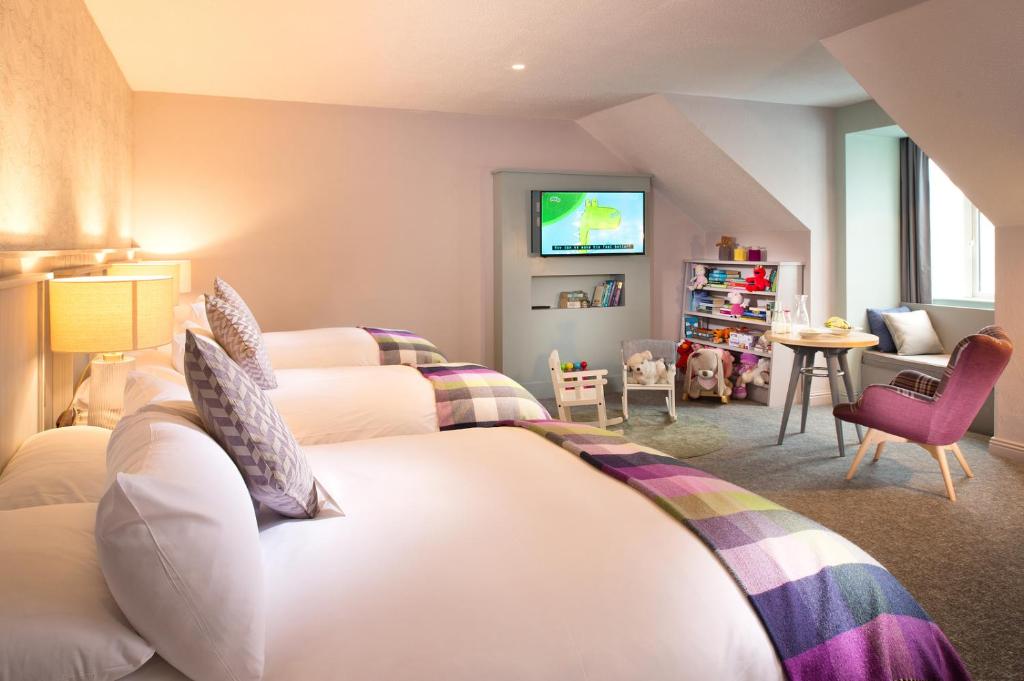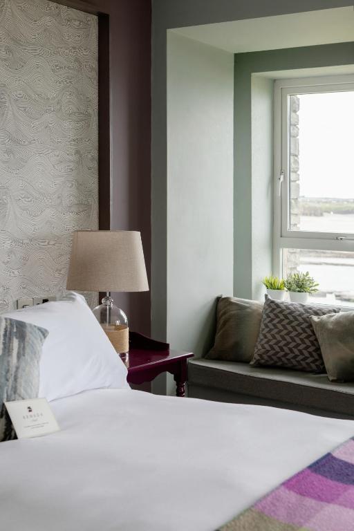 Our rooms are the perfect retreat for you to return to after a day of exploring the natural beauty of West Clare, or from your adventures along the Wild Atlantic Way. All our guest rooms are uniquely designed by a team of Irish designers. The rooms and suites are generously sized with simple fabrics and furnishings made by local craftspeople. Our interiors have been chosen to bring the outside in, reflecting the colours and energy of the hotel’s natural surroundings, from the Abigail Edward’s seascape wallpaper, the Irish handwoven tweed blankets draped over each guest bed, Kevin Lowery art featuring some of the most popular surfing waves, to handpicked locally harvested seaweeds used in our beautiful Handmade Soap Company products supplied in every guest room… We hope you rest well with us.