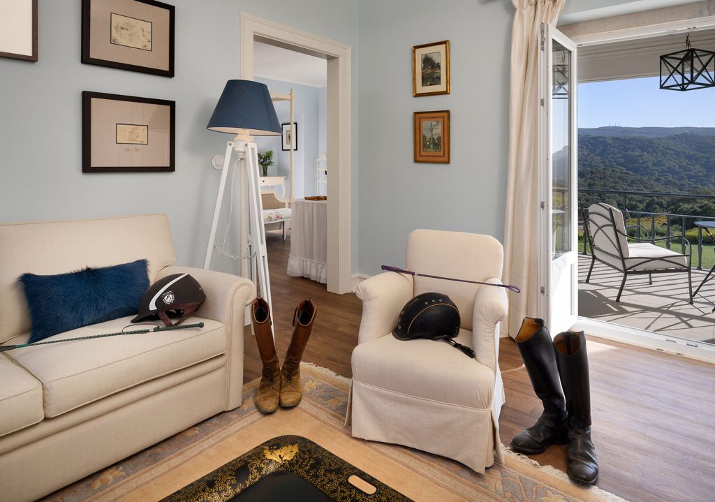 This is the most emblematic room at the Hotel Casa Palmela, featuring a separate internal living area and balcony, an internal social area, and a balcony overlooking the gardens and the Arrábida mountain range. Natural light illuminates the entire space, making it even more special.